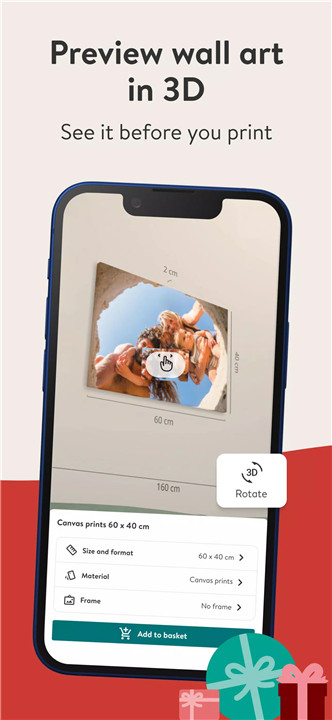 You can create posters, canvas, acrylic, or aluminium prints. Use the 3D preview to see how your wall art will look before printing.
