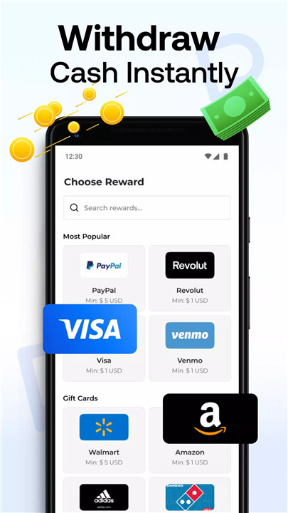 Rewards can be redeemed via PayPal or as gift cards, with fast payouts and low withdrawal requirements.
