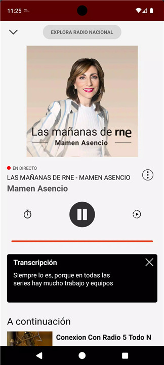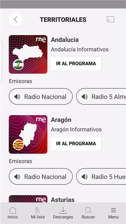 The “Parrilla” section provides a complete daily schedule, allowing quick access to the latest episodes of each program. In “Territoriales,” live broadcasts from regional RNE stations are available, along with regional and provincial news programs, ensuring comprehensive national coverage.