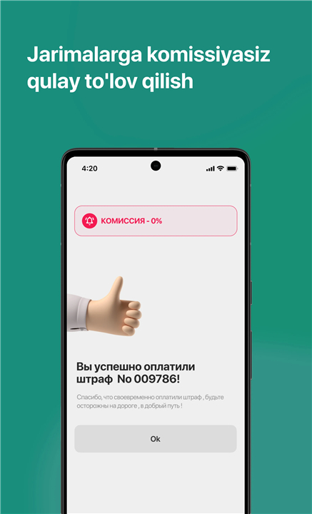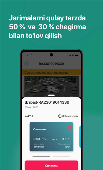 • Pay fines directly from the app using your Uzcard or Humo bank card.