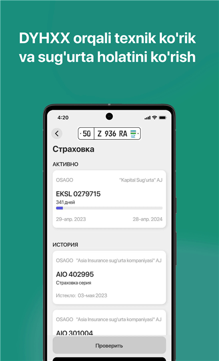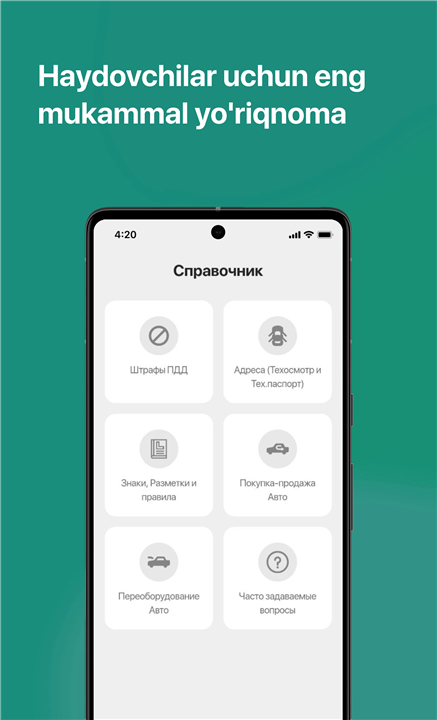 • Instantly check fines using your vehicle's license plate, technical passport series, PINFL, or driver's license number.