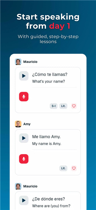 The platform uses guided audio lessons, conversation practice, and voice recognition to train learners to speak confidently from day one.