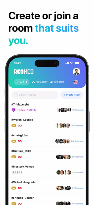 Roomco is a vibrant, 100% live social network designed for genuine connections through chat rooms and themed communities. Unlike traditional social apps focused on appearances, Roomco emphasizes shared interests and authentic conversations. With an easy-to-use platform and safety as a top priority, Roomco offers a welcoming space where people worldwide can connect, chat, and grow their social circles.