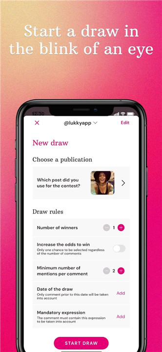 Lukky enables users to create unlimited contests or import existing ones in seconds. Each giveaway can be customized with a range of rules tailored to Instagram and Facebook. This includes selecting up to 20 winners, setting mandatory phrases, requiring a minimum number of mentions, filtering by date, and choosing whether duplicates should be removed. The free version supports planning as many contests as needed, while the Pro version unlocks unlimited draws and advanced configurations.