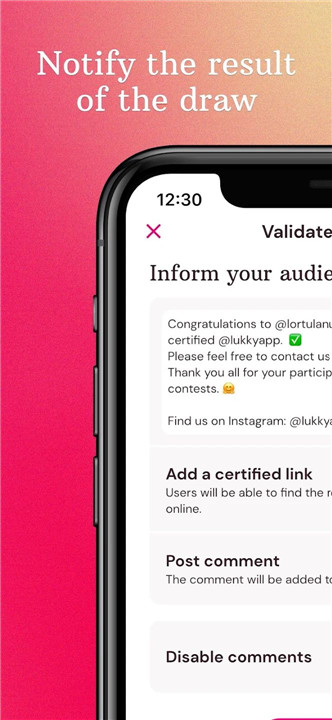 Selecting winners is fast and transparent. Up to 20 winners can be drawn instantly, and results can be shared as animated videos using professionally designed templates. Lukky supports direct sharing to Instagram Stories, Instagram Posts, Facebook Stories, Facebook Posts, and more. Videos can also be saved to the device for later use. If needed, draws can be restarted, and winners can be contacted automatically via DM.