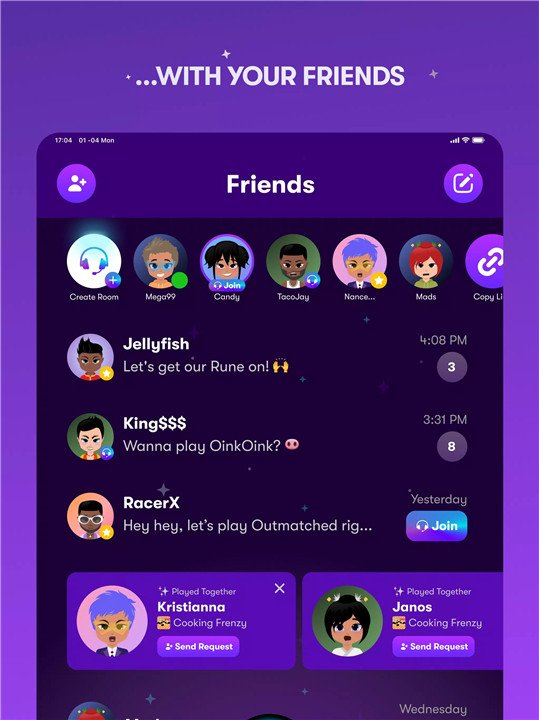 Never miss a hangout session again. Rune gives you push notifications when your friends are online and ready to play. Instantly see what they’re playing — whether it’s a Rune game or a popular third-party game — and join the fun with a tap.