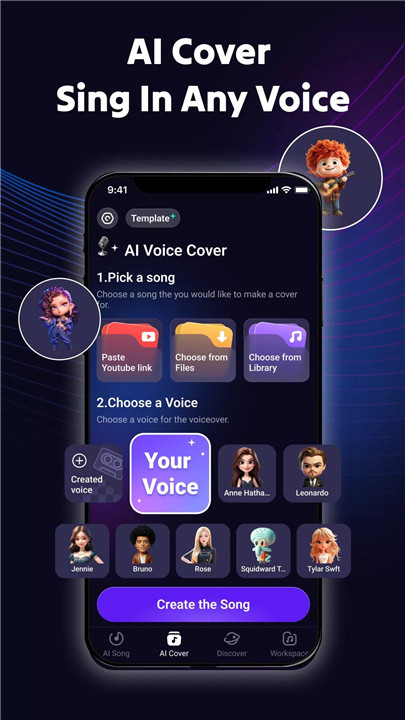 Transform any existing song with unique AI-generated voices or your own recorded vocals. Rythmix can produce stunning AI covers that enhance content, entertain friends, or add originality to social media posts.