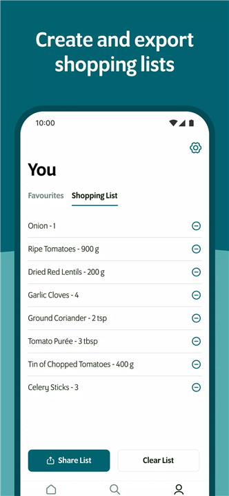 The app enables users to generate and export shopping lists directly from selected recipes. This streamlines grocery shopping and helps ensure that all required ingredients are accounted for before cooking.