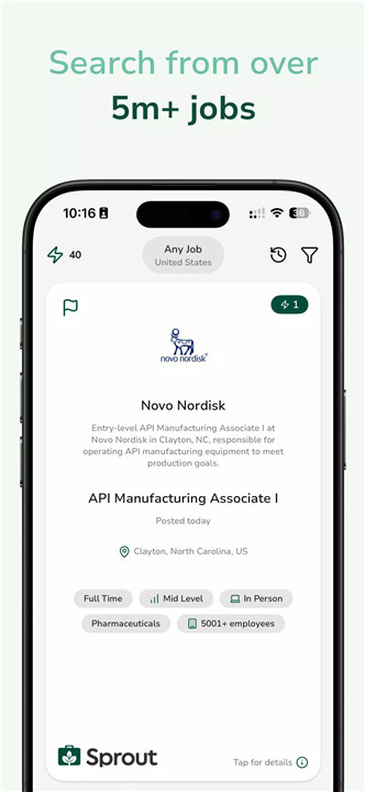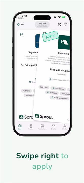 Sprout introduces a swipe-based job discovery experience that allows users to browse through millions of roles quickly. Instead of navigating multiple job boards and search filters, opportunities can be reviewed and saved with simple gestures, making the discovery process faster and more engaging.