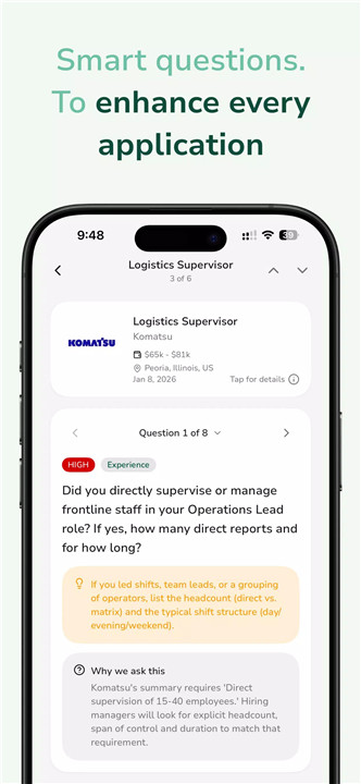 For every job selected, Sprout compares the role’s requirements with the user’s profile. The platform then asks a small set of focused questions designed to clarify experience, fill in missing details, and highlight strengths that are relevant to the position. This approach improves the accuracy and relevance of application materials.