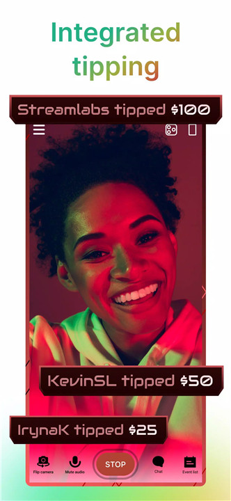 Streamlabs includes an in-app tipping system that allows creators to collect tips directly from viewers. On-screen tip alerts provide instant recognition, and Streamlabs does not take a cut, ensuring creators keep more of their earnings.