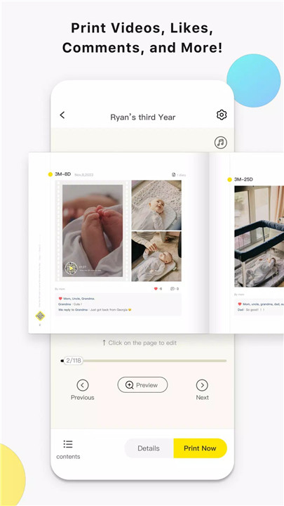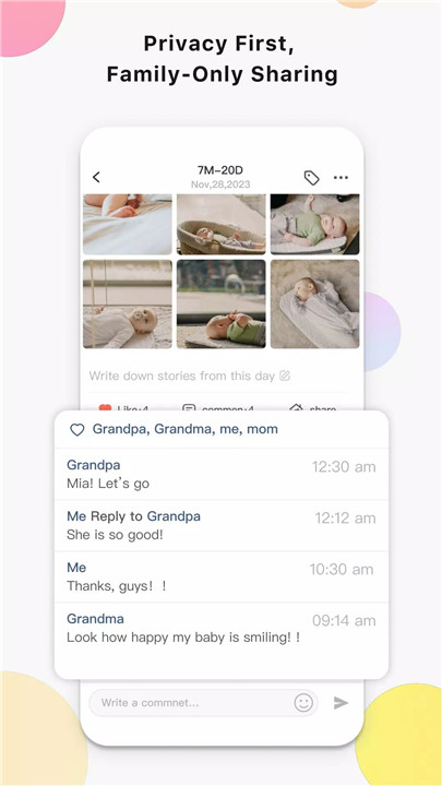You can share your baby’s timeline exclusively with invited family members, friends, and close buddies. The app offers customizable privacy settings to control who can view or interact with your baby’s memories. Your connections can also engage by adding captions and comments, turning the timeline into a collaborative album filled with love and happiness.