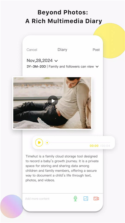 TimeHut lets you upload and securely store all your baby’s photos and videos online. It supports multimedia, so you can add not only pictures but also audio diaries and future letters. Every entry is automatically arranged in chronological order based on your baby’s age, making it easy to follow their growth journey over time.