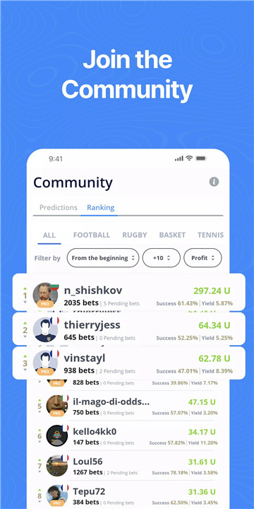 Join a growing community of betting experts and enthusiasts. Share predictions, follow certified tipsters, and learn from real-world strategies. Whether you're validating your picks or discovering new ideas, the Tipster network makes collaboration easy.