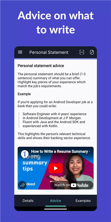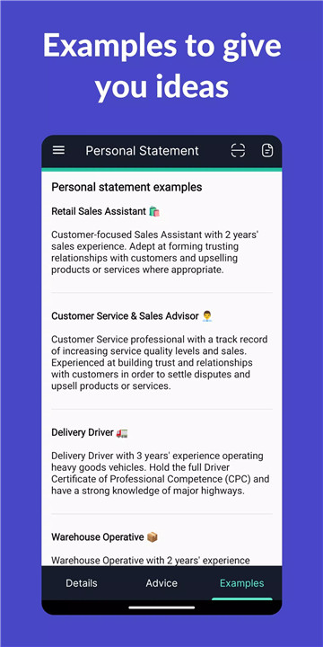 Access sample content and inspiration for each resume section. These examples cover multiple professions and experience levels, helping users craft relevant and effective resumes.