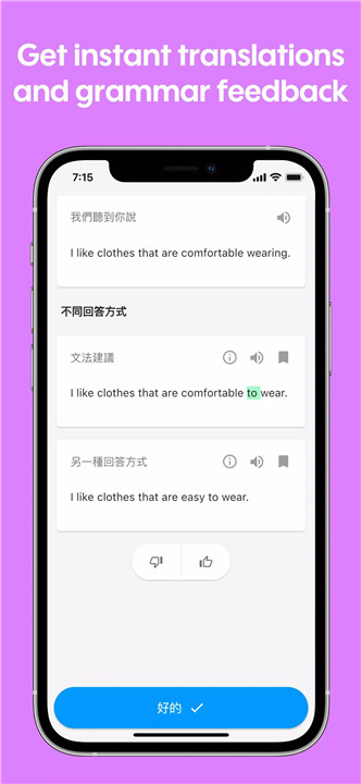 The app offers real-time grammar corrections, phrasing suggestions, and pronunciation guidance. This ensures that every interaction doubles as a learning opportunity, just like having a personal 1:1 tutor.