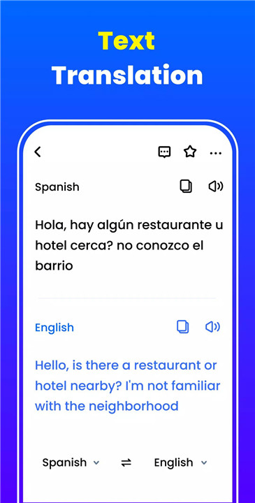 The app includes features such as reverse translation, text-to-speech output, translation history management, and easy sharing options. Its simple and clean interface ensures smooth navigation and ease of use.