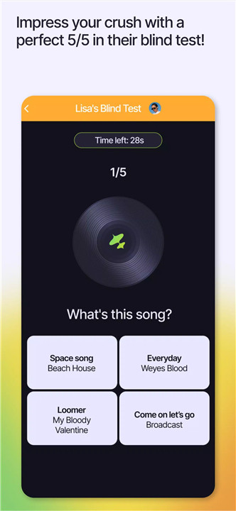 Blind tests are a core feature of Turn Up, allowing users to challenge potential matches with music quizzes. This interactive element combines fun and connection, letting users show off musical knowledge while discovering compatible people.