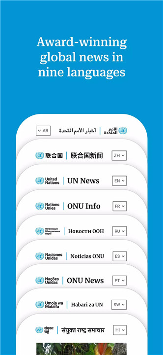The app is fully multilingual, supporting Arabic, Chinese, English, French, Russian, Spanish, Kiswahili, Portuguese, and Hindi.