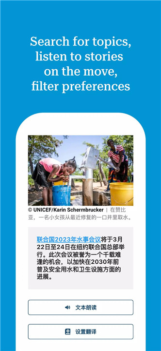The app offers news articles, videos, podcasts, audio programs, photo features, in-depth stories, field reports, and interviews with UN officials.