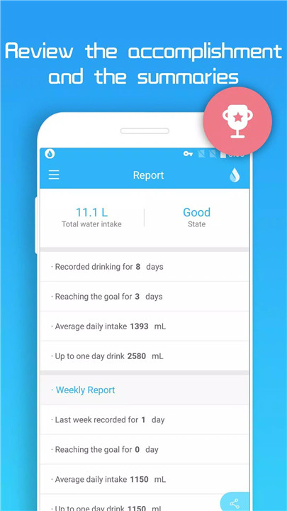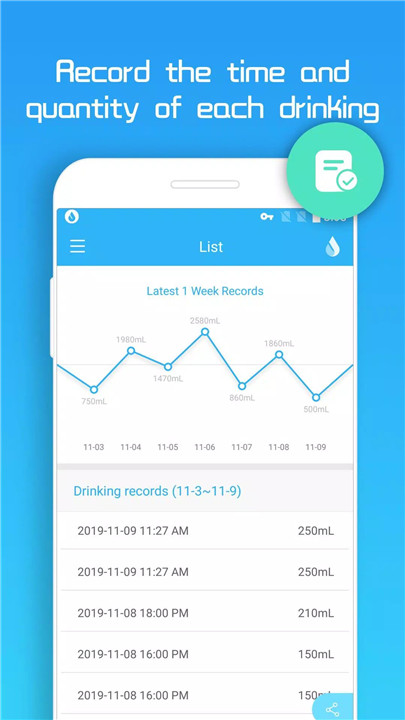 The app’s statistics dashboard is designed to give you a clear snapshot of your hydration patterns. Instantly see your performance with colorful graphs and easy-to-read metrics.