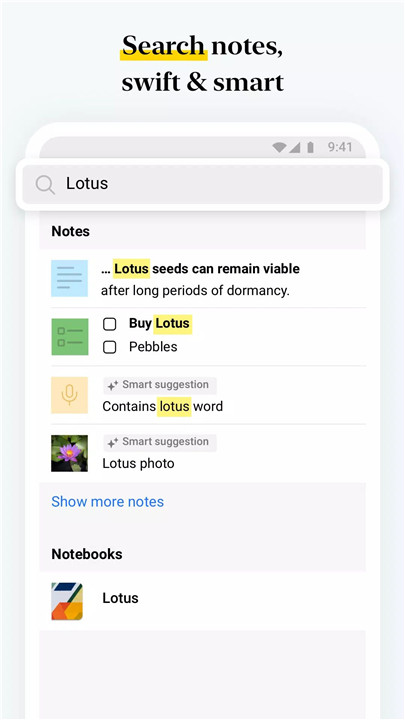 Notes can be grouped into nested notebooks and organized using tags and custom sorting options. Advanced search capabilities allow quick retrieval of information across all notes. For enhanced privacy, Zoho Notebook offers passcode protection, fingerprint unlock, and face recognition security features.