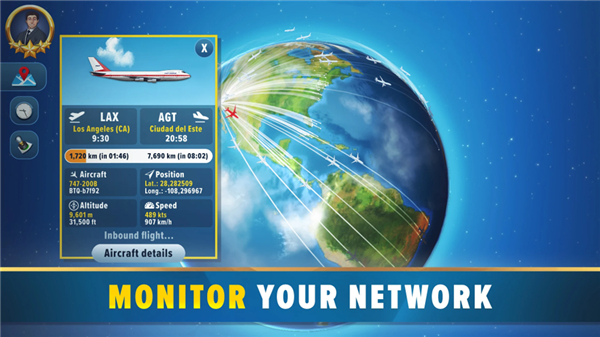 Monitor all your flights in real-time through a detailed and dynamic world map. This key feature allows you to observe aircraft movements, track profits, and adjust strategies instantly.