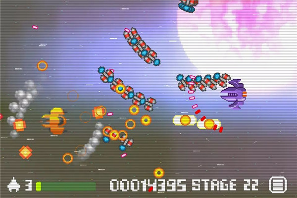 With more than 20 levels, the game avoids repetitive gameplay by introducing diverse environments and enemy behaviors. Enemies differ in hit points, formations, and special attack patterns, including bullet-hell barrages and enemy-spawning units that increase the challenge.
