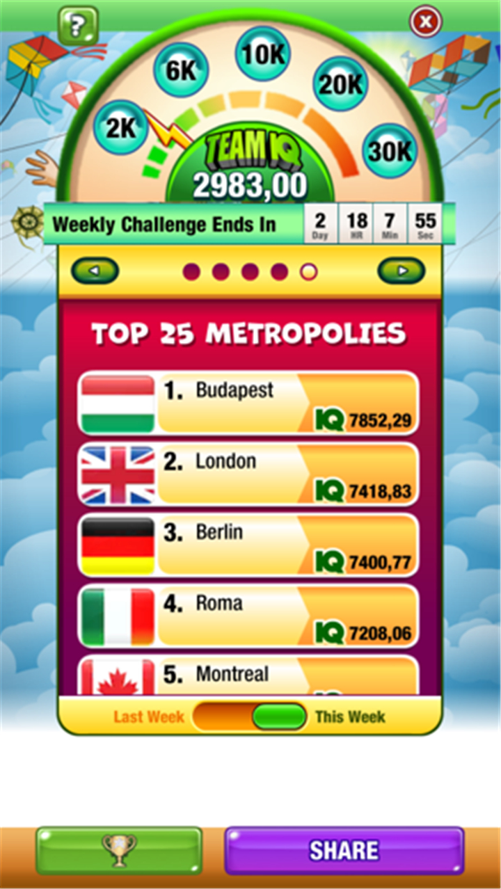 Join weekly competitions running from Monday to Sunday and see how you rank against other players in your city, country, and around the world. This feature adds excitement and motivation to keep improving your score.