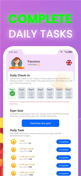 Dget Quiz: Daily Task, LevelUp