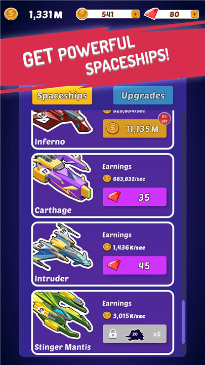 A wide variety of spaceships can be unlocked and upgraded. Starting from basic models, the fleet evolves into advanced vessels capable of generating higher returns. Upgrades enhance efficiency and open up new opportunities for expansion.