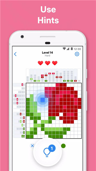 Numbers on the top and left of the grid show how many squares of each color to paint. Different color groups can be adjacent, but identical color groups must be separated by at least one empty square, which you mark with an X. If you get stuck, hints and extra lives help you keep going.