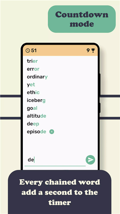 Countdown mode adds an element of speed and excitement. Players have 60 seconds to create the longest possible word chain before the timer runs out. Quick thinking and vocabulary knowledge are key to building the most impressive chain before time expires.