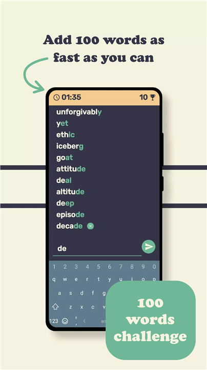 The 100 Words mode tests endurance and vocabulary mastery. The objective is to successfully chain together 100 words in a row as quickly as possible. Fast completion times can place players at the top of the leaderboard, making this mode perfect for competitive players.